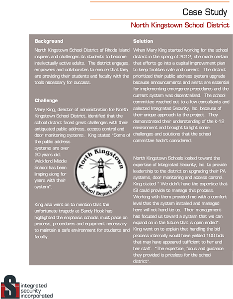 Integrated Security, Inc. is a full service security provider from consultation to design and integration.  Our consulting practice was born out of our experience as a security integrator.  Our comprehensive experiences across multiple markets and business functions provides us with the leadership to collaborate with clients in their pursuit of becoming high-performance and resilient organizations.  Our consulting approach is diagnostic in nature and provides the client with product and design standards, resources and policies and procedures that create the framework for that resiliency.